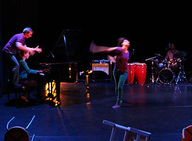 Voyage polyphonique insolite, Soigne ton Swing danse avec les mots, imagine les sons et rythme les images. Une danseuse, un acteur, une pianiste et un percussionniste donnent corps aux textes d'Arthur Mictus